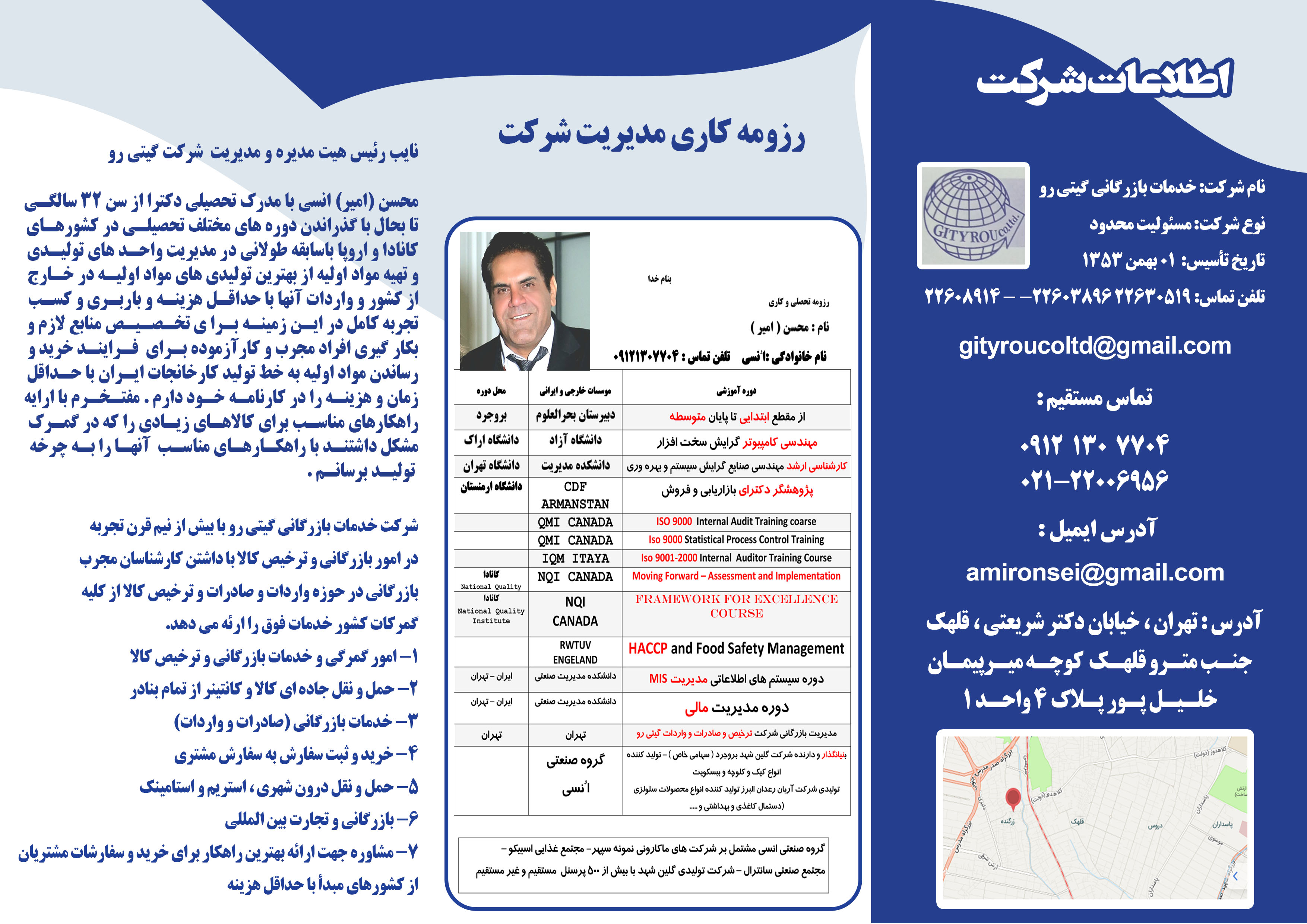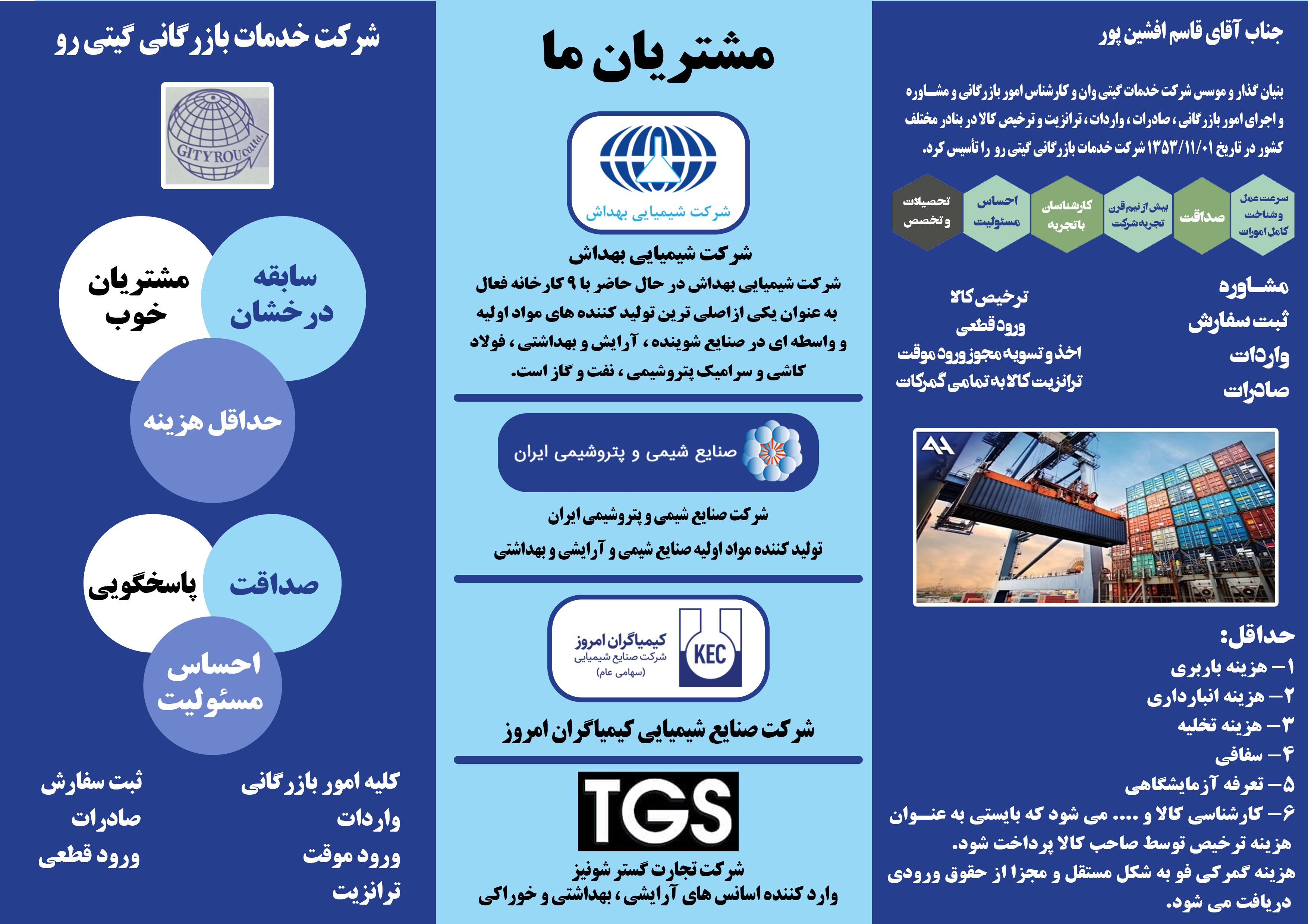 شرکت بازرگانی گیتیرو با بیش از 52 سال سابقه درخشان در حوزه تجارت بینالمللی، یکی از معتبرترین مجموعههای فعال در زمینه تولید، ترخیص و مشاوره بازرگانی است. این شرکت با تکیه بر تیمی مجرب شامل دارای مدارک دکترا و سابقه چند ده ساله، خدمات دقیق، سریع و قانونی میدهد. از مهمترین خدمات گیتیرو میتوانم به ثبت سفارش، ورود موقت، ورود قطعی، ترانسیت و حل اختلافات گمرکی اشاره کنم.